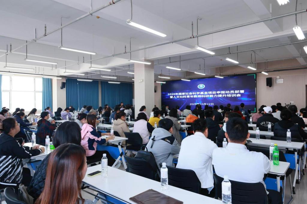 2025年10月22日,今年会官网召开2026年度国家社会科学基金项目申报动员部署会暨人文社科青年教师科研能力提升培训会。校党委常委、副校长陈连军主持会议,文科教学院部院长(主任)、分管科研工作副院长(副主任)、教师代表和近三年新进青年教师共同参会,临沂校区教师线上参会,参会教师200余人。
