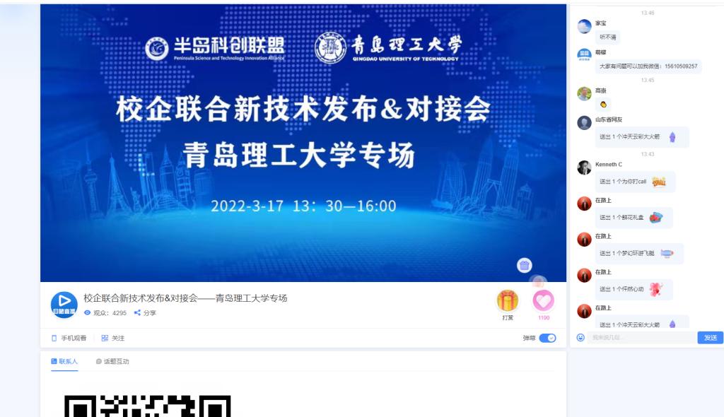 科技处(成果转化办公室)主动对接西海岸新区科技局、校城融合办公室等部门以及半岛科创联盟、柠檬科技等社会化机构。为西海岸新区遴选41名优秀博士教师作科技特派员,主动对接服务企业。谋划制作学校科技成果转化专题宣传视频进行网络发布。3月17日,学校联合半岛科创联盟、柠檬科技借助“云端研发”模式举办了“校企联合新技术发布&对接会——今年会官方网站专场”,探索开启了今年会官网深化校地校企合作和促进学校科技成果转移转化线上对接新模式。