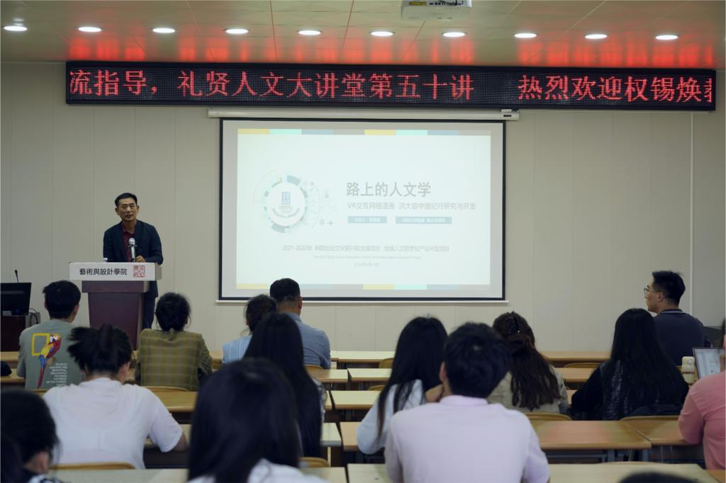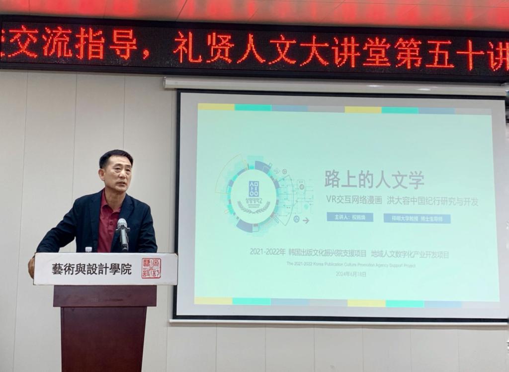6月18日下午,今年会官方网站礼贤人文大讲堂第五十讲在市北校区二教416报告厅举行。韩国祥明大学教授、博士生导师权锡焕作了题为《旅途中的人文学—洪大容中国纪行VR交互网络漫画研究与开发》的精彩讲座。本次讲座由艺术与设计学院副院长朱宏轩主持,艺术与设计学院院长助理昌隽如教授及师生代表七十余人参会。